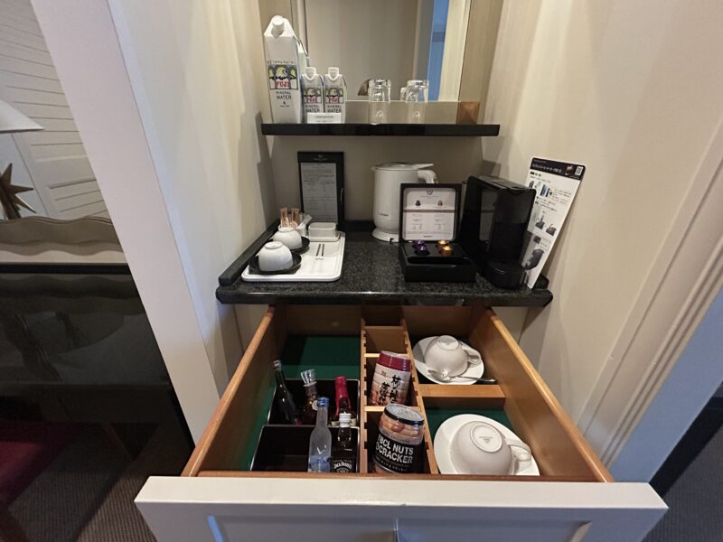 客室内には電気ケトルがあり、コーヒー・ほうじ茶・緑茶が置いてありましたが、2階ラウンジに行くことが多かったので、部屋ではあまり飲みませんでした。