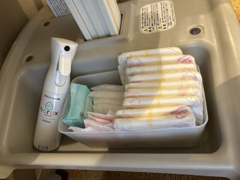 コットの中身は、おむつ(メリーズ)、お尻拭きだけでなく、母乳パッド&生理用ナプキンが入ってました。