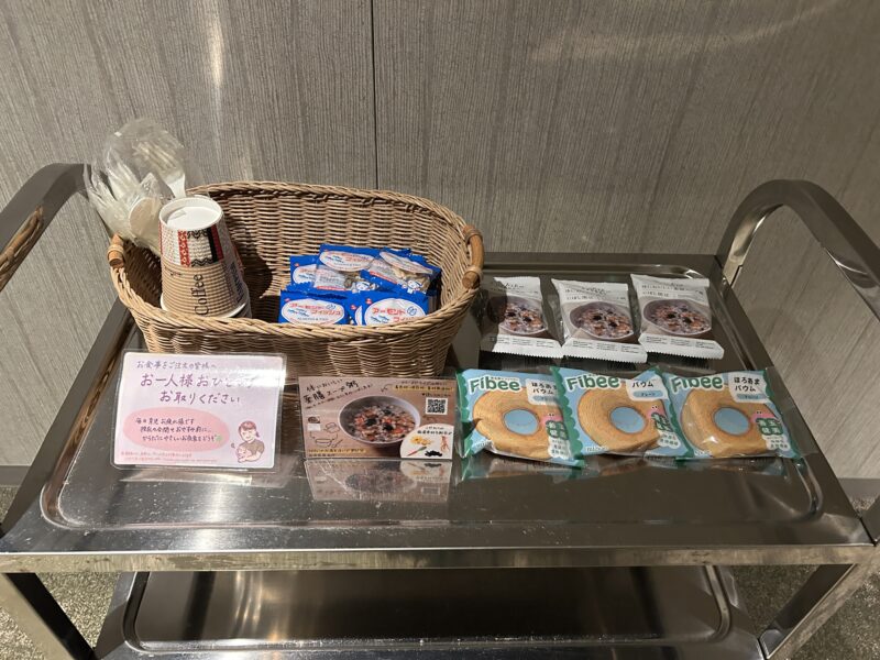 朝食は1階レストランでのビュッフェ形式で、夜食は客室前通路に置いてあるコンテナから各自好きに取っていくスタイルでした。